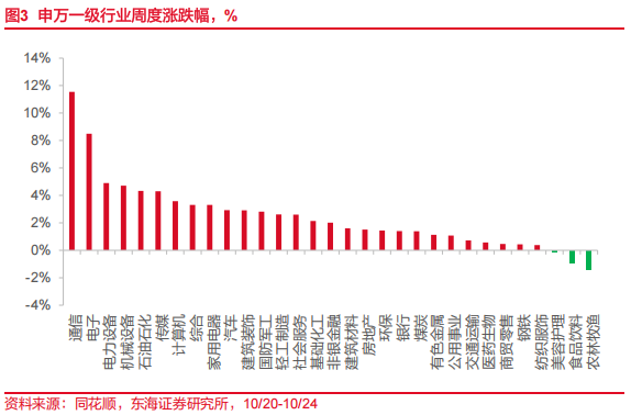 国内权益市场:至10月24日当周,风格方面,成长>周期>金融>消费,日均成交额为17815亿元(前值21766亿元)。申万一级行业中,共有28个行业上涨,3个行业下跌。其中,涨幅靠前的行业为通信(+11.55%)、电子(+8.49%)、电力设备(+4.90%);跌幅靠前的行业为农林牧渔(-1.36%)、食品饮料(-0.95%)、美容护理(-0.09%)。