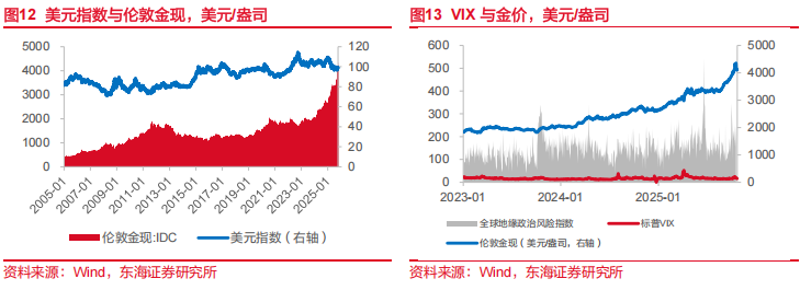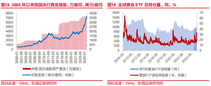 美国政府进入第四周停摆,特朗普对俄罗斯政策再次缓和,周内金价急跌后有所修复。截至2025年10月24日,伦敦金现收于4111.56美元/盎司,较上周同期下跌3.29%,周内最高触及4381.48美元/盎司的高点但随后跳水,下半周有所修复。美股三大指数周内震荡上行,美元指数在99关口下震荡运行。若美国化债持续遇阻,预计美元或大幅贬值。9月我国央行继续增持黄金储备1万盎司。市场预期美联储年内仍将降息两次,押注10月将降息25个基点。SPDR持有量继续大幅上升达近两年新高,政策面上美国贸易协定、俄乌冲突等仍存在较大不确定性。整体来看,美元及美债的避险属性被削弱,黄金避险需求凸显,美元贬值预期走强,黄金长期上涨逻辑增强。