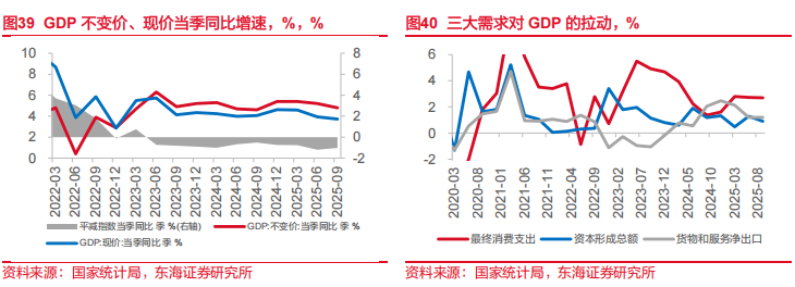 实际GDP增速符合预期,平减指数降幅收窄。2025Q3GDP不变价当季同比4.8%,较Q2回落0.4个百分点,略高于Wind一致预期的4.76%。GDP增速的回落,拖累或主要来自于三季度以来投资端增速的明显下滑,而消费方面服务虽然稳固,但补贴退坡下实物消费有所回落,出口结构多元化下的韧性是主要支撑。2025Q3名义GDP同比3.73%,延续年内回落的趋势,但受益于反内卷的催化,平减指数自2024Q3以来首次降幅收窄。从三大需求来看,2025Q3最终消费支出、资本形成总额、货物和服务净出口对GDP的拉动分别为2.7pct、0.9pct、1.2pct,分别较前值-0.02pct、-0.38pct、+0.00pct。