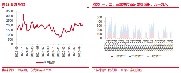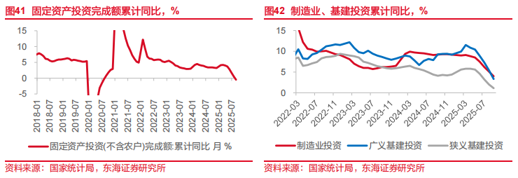 制造业投资延续回落。制造业投资当月同比降至-1.9%,连续3个月负增长。一是设备更新支撑的力度边际减弱,累计同比由3月的19%降至9月的14%。二是“反内卷”预期对制造业资本开支的影响。从主要行业来看,多数行业累计同比增速均有所回落,其中运输设备、食品制造、农副食品、金属制品等,不过以上行业均高于整体增速。增速偏低的行业如电气机械、化学原料等多为“反内卷”整治的重点行业。