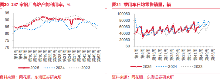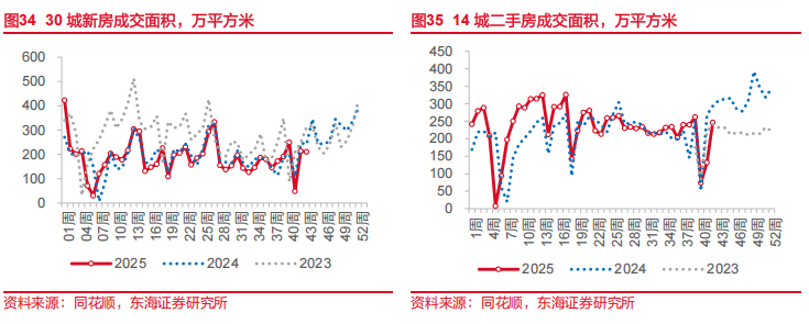 地产压力上升。9月新建商品房销售当月同比-10.54%,与前值基本持平,房地产投资当月同比降至-20.27%。地产四季度最大的压力还是来自于基数的抬升,去年在924政策提振下,四季度地产销售增速回升较为明显。虽然一线城市在近期新一轮的地产政策优化下,9月销售端有所修复,但截至19日,10月当月30城新建商品房销售面积同比仍为-20.73%,依然维持低位。为巩固房地产市场止跌回稳,四季度依然处在政策窗口期。