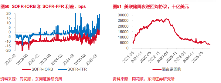 近期流动性压力之下(存款准备金接近“充足”门槛,担保隔夜融资利率SOFR持续高于联邦目标基金利率走廊上限),市场对美联储近期结束量化紧缩QT预期强烈。这一预期与连续降息预期共振,推动周内短端收益率(对美联储政策较长端更为明显)下行较多。
