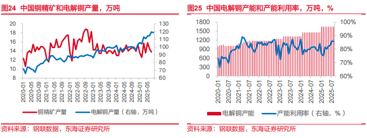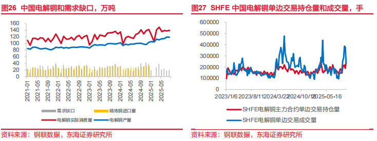 2025年9月,我国电解铜产量约为114.98万吨,环比减少3.2%,同比增幅14.5%,生产能力复苏较上期略有下滑,但下游需求维持旺盛状态。2025年9月,我国电解铜年化平均产能为1648万吨,产能利用率为83.98%。2025年9月我国电解铜产量和需求缺口约为29.04万吨,缺口较上期环比扩大39.95%。我国进口电解精炼铜总量基本可以覆盖生产需求缺口。