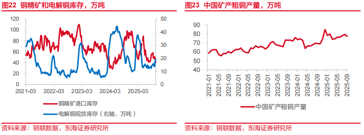 2025年10月24日,精炼铜现货库存为19.27万吨,较上周环上升5.8%,同比下滑11%,港口库存约为40.4万吨,环比下降14%。全球地缘和关税不确定叠加海外矿山供应扰动的市场背景,放大了现货库存和港口库存的背离。