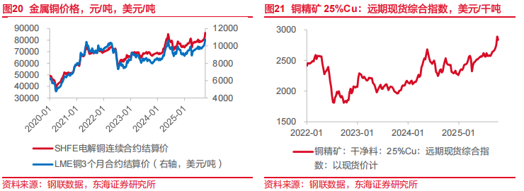 2025年,金属精炼铜价格震荡上行,10月24日,SHFE电解铜连续合约结算价格为85622元/吨,较上一周价格环比上升0.6%,价格与去年同比增长11.9%;LME伦铜3个月合约结算价为10669美元/吨。10月24日当周,我国铜精矿干净料(25%Cu)远期现货综合价格指数约为2865.8元/千吨,价格环比上升1.1%。全球铜价和铜精矿价格指数上升,主要受美联储降息预期强化及美元走弱提振,市场风险偏好回升。与此同时,智利和秘鲁部分矿区受天气与罢工影响导致供应预期收紧,带动铜价整体走高。