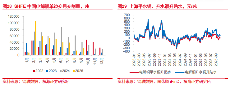 2025年10月24日当周,我国SHFE电解铜持仓量为243159手,环比上升28.9%;成交量为233105手,环比下降38.6%,随着铜价持续上行、宏观预期向好,部分机构投资者加仓多单以押注后市,而短线投机交易趋于谨慎,导致成交量减少。2025年9月,沪铜单边交易交割量为22050吨,明显低于去年同期交割水平。