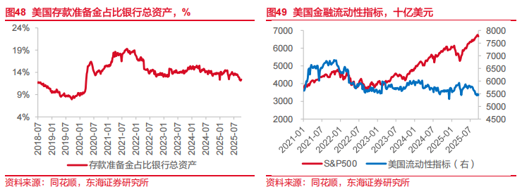 从量的角度来看,截至10月22日当周,美国流动性紧缺迹象略有缓和。当周TGA余额继续抬升,增加531.2亿至9050.7亿美元,为2024年5月以来的最高值。值得注意的是,当周金融流动性补充几乎完全来自于银行系统中的存款准备金账户(减少了585.7亿美元),而隔夜逆回购账户当周则回升了65.2亿美元。我们认为这或是由于当周消息释出:“美联储拟大幅度放松美国银行资本金要求”,导致美国银行风险偏好升高,信贷规模扩张,而过剩的流动性则流入了逆回购账户,呈现出当周逆回购账户和TGA账户同升的情况。美联储资产端来看,包含了SRF(常备回购便利工具——可看作流动性紧急补充阀门)的正回购协议操作量在当周已经回到0值,表明上周流动性极度紧缺问题已经得到解决。