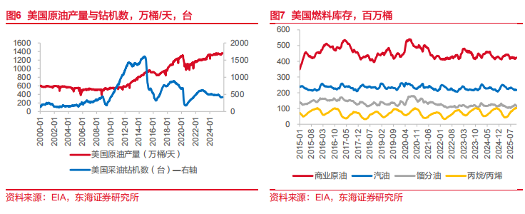 截至10月24日当周,WTI原油周内上行,收于61.50美元/桶,较上周上行6.9%。截至2025年10月17日当周,美国原油产量为1362.9万桶/天,同比增加12.9万桶/天。美国炼厂吞吐量为1573万桶/天,开工率88.6%。10月24日当周,美国钻机数550台,较去年同期减少35台;其中采油钻机数420,较去年同期减少60台。
