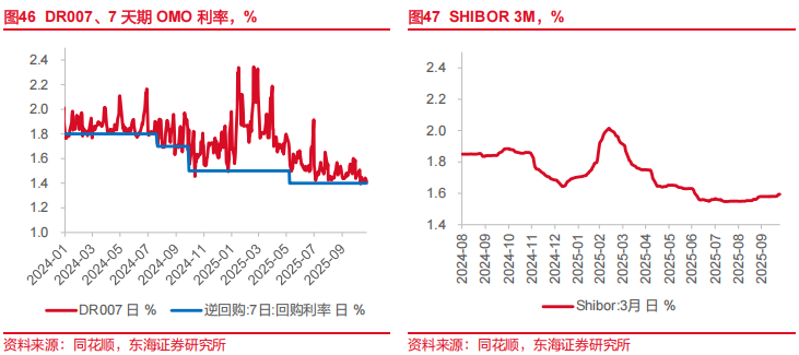 资金利率上升。10月24日当周,DR007周均为1.4294%,较上周环比上升0.88个BP。SHIBOR3M周均为1.5896%,较上周环比上升0.89个BP。