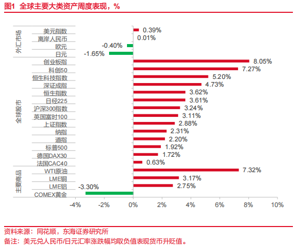 10月24日当周,全球主要股市反弹,A股表现突出。主要商品期货中原油、铜、铝上涨,黄金收跌;美元指数上涨,人民币小幅升值,日元、欧元贬值。1)权益方面:创业板指>科创50>恒生科技指数>深证成指>恒生指数>日经225>沪深300指数>英国富时100>上证指数>纳指>道指>标普500>德国DAX30>法国CAC40。国内来看,二十届四中全会召开,公报中科技及现代化产业体系的重要性提升,叠加中美贸易摩擦的缓和,A股风格切换,成长大幅反弹。海外来看,推迟公布的9月美国通胀数据进一步强化10月降息25bp的预期,信贷风险以及贸易摩擦情绪的暂时退场推动美股反弹。2)地缘政治局势有所反复,美对俄实施新制裁推升油价当周大幅反弹;避险情绪回落及技术性因素影响下,金价当周大幅波动,COMEX黄金期货价格10月21日单日大跌5.07%。3)工业品期货:南华工业品价格指数上涨,螺纹钢、炼焦煤小幅上涨,水泥、混凝土小幅下跌;高炉开工率当周环比上行0.44pct;乘用车日均零售5.94万辆,环比3.85%,同比-6.00%;BDI环比下跌3.8%。4)国内利率债收益率延续分化,全周中债1Y国债收益率上行2.82BP至1.4716%,10Y国债收益率上行2.40BP收至1.8486%。5)美债收益率震荡。2Y美债收益率当周下行2BP至3.48%,10Y美债收益率持平于前值,收于4.02%;10Y日债收益率上行2.9BP至1.6670%。6)美元指数收于98.9393,周上涨0.39%;离岸人民币对美元升值0.01%;日元对美元贬值1.65%。