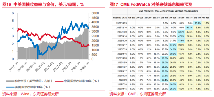 美债利率震荡运行,中债利率略有上行。截至10月24日,10Y美债利率震荡运行,较上周同期维持一致于4.02%,10Y中美利差倒挂值为217.14bp,较上周略有收窄。中国10Y国债利率本周震荡运行,最终报收1.8486%,较上周同期上行2.4bp。2025年9月美国CPI同比上涨3%,前值2.9%,略低于市场预期。9月,我国制造业PMI为49.8%,较前值提高0.4个百分点;美国制造业PMI为49.1%,因为美国政府关税政策持续带来不确定性,美国制造业连续第七个月收缩。