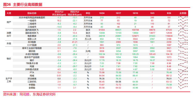 出口带动下工业生产提速。9月规模以上工业增加值季调环比0.64%,高于近5年同期均值的0.58%,同比反弹至6.5%。一是出口带动生产较为明显,9月出口交货值由前值的-0.4%升至3.8%,沿海地区浙江、广东分别由8月下降转为增长5.4%、2.8%,江苏、福建分别增长6.8%、5.2%。二是高技术制造业支撑,10月增速回升至两位数以上,高于整体工业增加值增速3.8个百分点。分行业来看,增速提升较为明显的有油气开采、通用设备、汽车、食品、医药、酒饮料等。从主要工业品产量来看,汽车已连续两个月维持两位数以上增长。