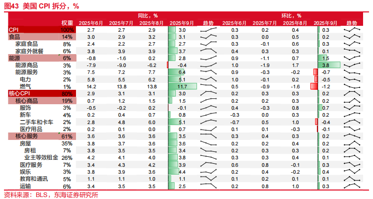 关税对核心商品价格影响减弱。核心商品同比保持在1.5%不变,环比由前值0.3%小幅回落至0.2%。受关税影响较大的服饰和新车,环比增速略有放缓,均回落0.1个百分点分别至0.7%和0.2%。二手车成为当月价格跌幅最大分项,环比由前值1.0%下降至-0.4%,和曼海姆二手车价格指数依然保持一致,同时后续来看二手车价格或在低位持续震荡。医药用品价格反弹较为亮眼,同比由前值0.0%上升至0.7%,环比则由前值-0.3%回升至-0.1%,这或是由于在特朗普计划药品新关税后促使美国药商提前涨价。
