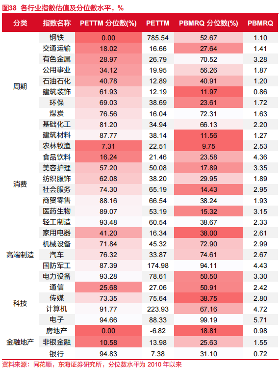 主要行业估值(PE)分位数水平:周期:交通运输<有色金属<公用事业。消费:农林牧渔<食品饮料<美容护理。高端制造:家用电器<机械设备<汽车。科技:通信<传媒<计算机。金融(PB):房地产<非银金融<银行。