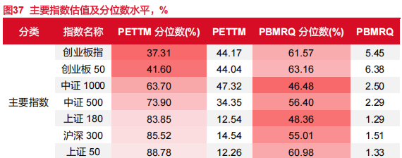 主要指数估值(PE)分位数水平:创业板指<创业板50<中证1000<中证500<上证180<沪深300<上证50<科创50。