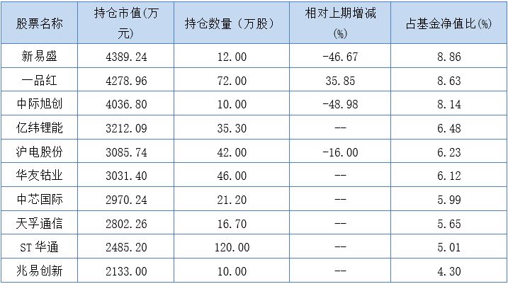 从他的操作来看,调仓幅度比较大。增持一品红,减持新易盛、中际旭创、沪电股份。同时,亿纬锂能(维权)、华友钴业、中芯国际、天孚通信、ST华通(维权)等个股新进前十大重仓股,胜宏科技、芯源微、莱绅通灵、潮宏基、生益科技、春风动力则掉出前十大重仓股行列。
