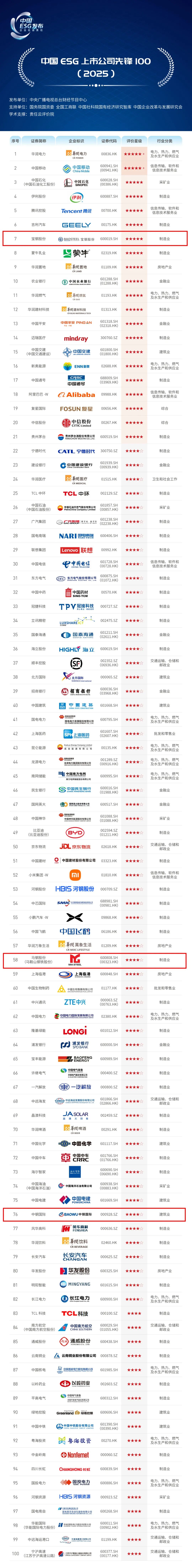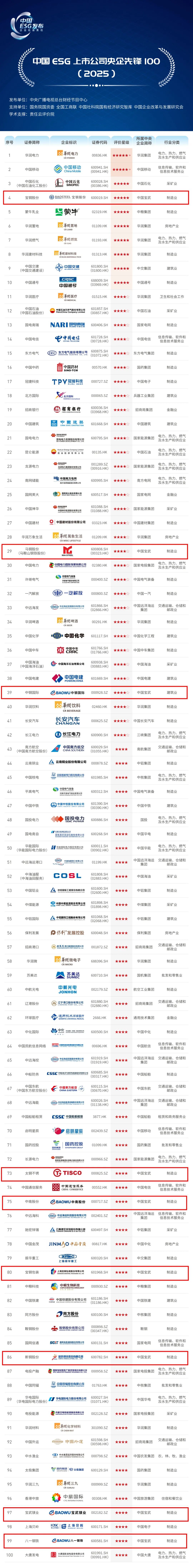 在“中国ESG上市公司先锋100”榜单中,宝钢股份(位列第7)、马钢股份(位列第58)、中钢国际(位列第76)3家上市公司入围;在“中国ESG上市公司央企先锋100”榜单中,有9家上市公司上榜,分别是宝钢股份、马钢股份、中钢国际、太钢不锈、中南股份、宝钢包装、新钢股份、宝武镁业、八一钢铁。