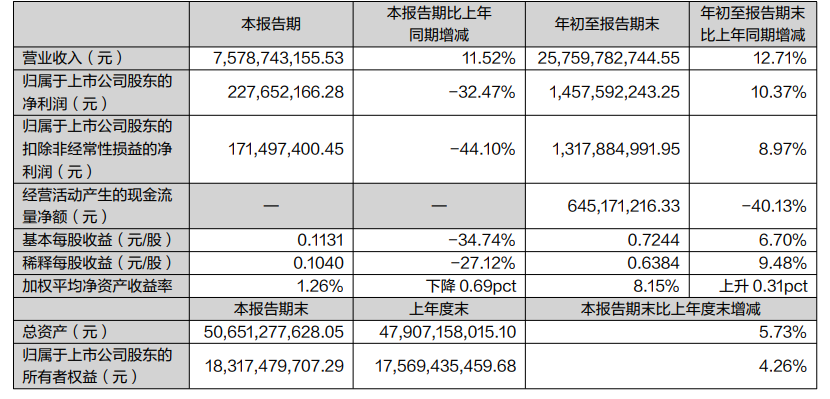 2025年第三季度,柳工实现营业收入75.79亿元,同比增长11.52%;归母净利润2.28亿元,同比下降32.47%。