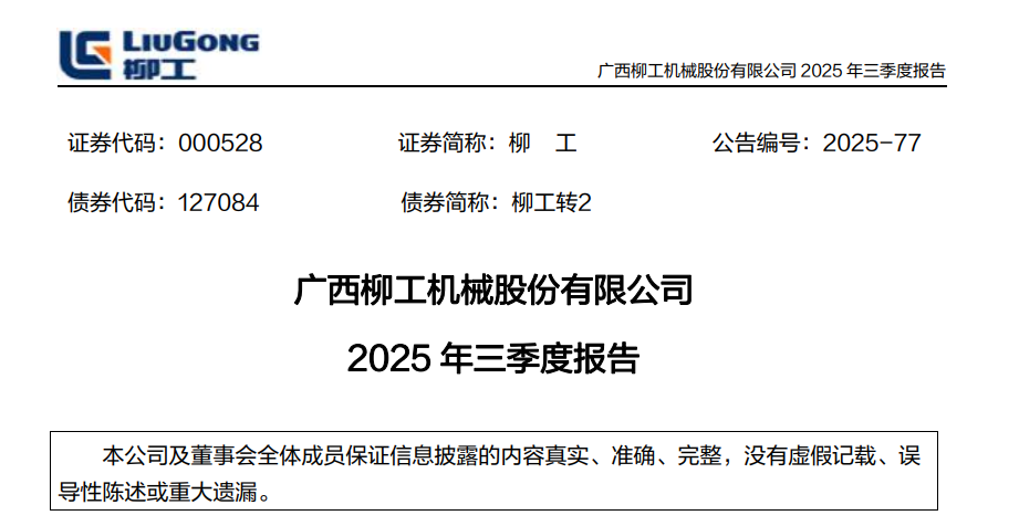 2025年前三季度,柳工实现营业收入257.60亿元,同比增长12.71%;归属于上市公司股东的净利润14.58亿元,同比增长10.37%;经营活动产生的现金流量净额6.45亿元,同比下降40.13%。