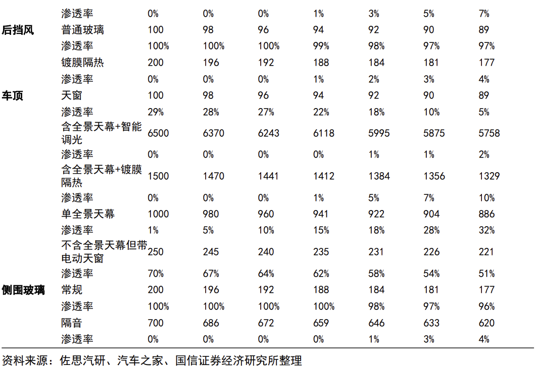 汽车玻璃是单车应用面积最大的零部件,天幕及智能化应用空间广阔,ASP及单车面积有望同步提升。90年代汽车单车玻璃面积已经达到4㎡,经过model y对天幕玻璃、可开启的全景天窗等需求的培育,现在单车玻璃面积已达5㎡以上,成为单车应用面积最大零部件,考虑当前国内全景天窗渗透率已达49%,全景天幕渗透已达18%,产品逐步向标配渗透,车企差异化竞争需求迫使行业进一步迭代。单车玻璃面积有望持续上升,同时智能调光、隔热等智能化玻璃有望加速上车,和智慧车灯、智能内饰等提供智能化驾车体验,汽玻市场空间广阔。