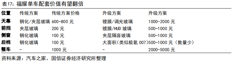 福耀配套玻璃价值有望从1000元向2000元以上加速增长。目前福耀已经在汽车玻璃关键成型工艺和设备、玻璃天线、镀膜、光电等核心技术领域实现突破,陆续研发出轻量化超薄玻璃、镀膜可加热玻璃、抬头显示玻璃、超隔绝玻璃、带网联天线的ETC RFID 5G玻璃、智能全景天幕玻璃等。具体到车端则体现为天幕向镀膜升级、前挡向HUD升级、侧窗向隔音玻璃升级,单车价值从此前的600元向1000元、2000元水平增长,公司远期增量可期。