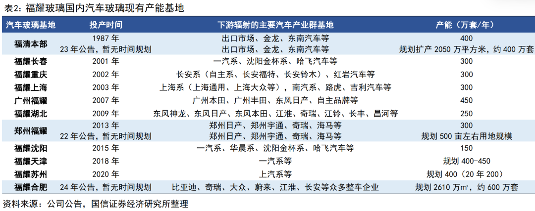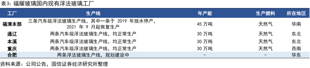 福耀国内布局持续拓展,围绕主机厂及港口在全国11个城市建设汽玻产能,国内现有产能约3250万套,配套福清、通辽、合肥等多地浮法产线建设。考虑国内承担内销及出口欧美重任,在福耀玻璃需求旺盛、公司产能利用率高位情况下,公司积极扩建合肥及福清工厂,预计在福清投资32.5亿元建设2,050万平方米汽车安全玻璃生产规模;在合肥投资57.5亿元,用于建设2,610万平方米汽车安全玻璃和两条优质浮法玻璃生产线。