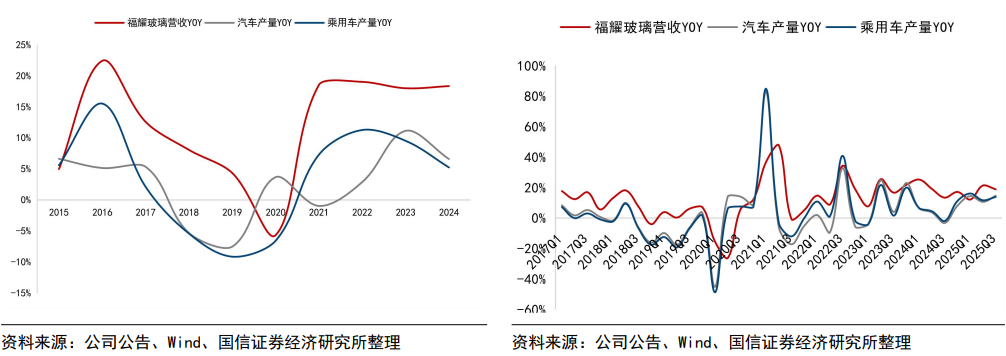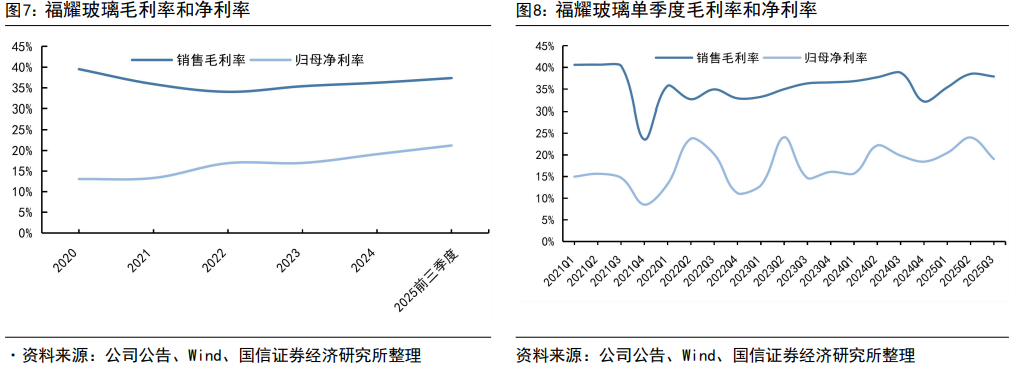 2025Q3公司持续跑赢国内汽车产量4pct。2013年以来,福耀玻璃年度营收增速和分季度营收增速波动走向大体和国内车市行业一致,其营收增速绝对值基本维持一定程度高于行业,根据中汽协,2025Q3国内汽车行业产量868.23万辆,同比增长15%,公司汽车玻璃营收同比增加19%,增速超越行业4pct。