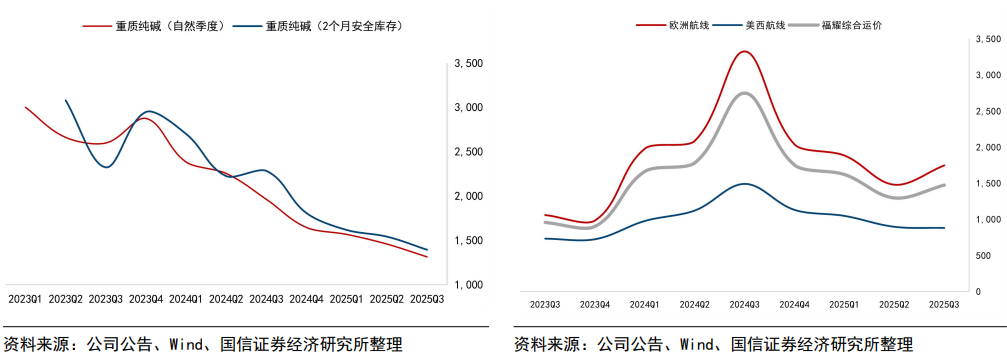 原材料价格贡献利好,后续有望持续受益于原材料及海运价格回落。公司核心原材料重质纯碱价格持续下降,2025Q3国内价格基本维持在1300元/吨左右,环比Q2的1300-1500元/吨价格持续回落,同比去年Q3的1600-2200元/吨价格明显下降,原材料持续贡献利好。向后展望,全年维度公司一方面受益于纯碱低价利好,一方面受益于自2024年3月开始上涨的海运费价格回落,伴随规模效应持续兑现,公司盈利能力提升可期。