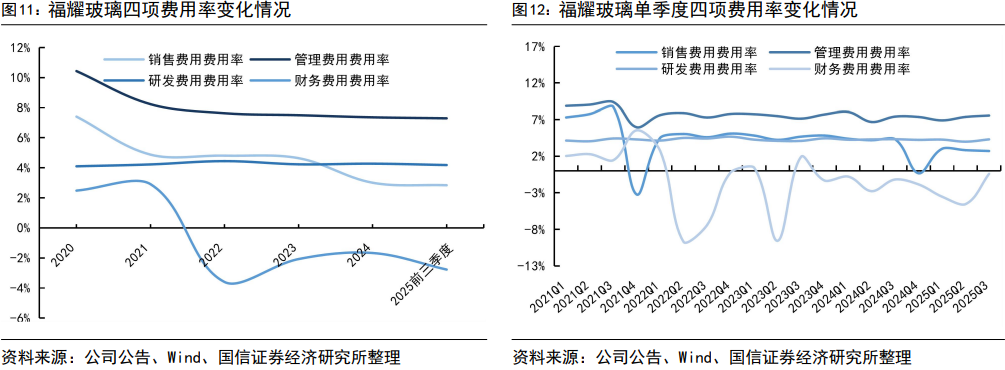 25Q3公司管理费用率同比下降0.7pct。公司2025年第三季度四费率为14.16%,同比-0.7pct,环比+4.5pct;其中销售/管理/研发/财务费用率分别为2.71%/7.56%/4.30%/-0.40%,同比变动-1.61/0.15/-0.02/0.78pct,销售费用率波动较大,主要受公司24年为进一步加强对汽车玻璃全工业链可追溯质量管理体系,将包装费用调整到营业成本影响;财务费用主要受汇兑收益影响。