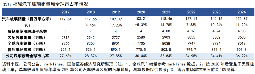 2024年,公司汽车玻璃销量155.87百万平方米,按每辆车4.33平米玻璃折算,相当于装配了3600万辆汽车,参考marklines数据,2024年全球汽车销量8724万辆,按照售后市场需求为汽车销量10%测算,公司汽车玻璃全球市占率36%+,同比+1.88pct。
