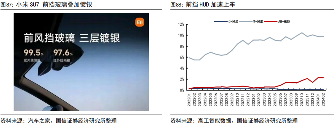 前挡玻璃适配HUD需求,镀膜产品开始上车。汽车行业从安装在仪表板上的小型2D屏幕,到可以将图像与车辆外部环境整合在一起的新一代3D增强现实抬头显示(AR-HUD)。HUD提升驾乘人员安全,预计2021年至2026年期间将以超过24%的复合年增长率(CAGR)持续发展。玻璃厂商关注前挡形态、层压工艺、层厚和楔角变化,保证HUD投射画面不失真,同时也有小米SU7等车型在前挡叠加镀银方案,进一步向隔热、提升前排舒适性升级。