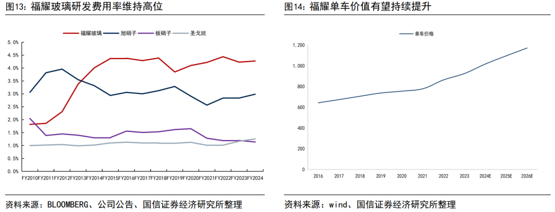 前瞻技术储备保证领先优势,公司单车价值持续提升。为保持竞争优势,福耀集团打造了一支超5600人的研发团队,并将每年营收的4%以上用于创新研发,研发投入从2010年的1.55亿元不断增长至2024年的16.78亿元,CAGR达18.5%,高于海外汽车玻璃龙头。如今福耀实现核心技术100%自主可控,先后主持或参与编制国内外标准53项,成功解决行业13项“卡脖子”技术难题。截至2024年底,福耀集团高附加值产品销售占比较上年同期上升5pct。从打破国外技术壁垒到探索未来创新,逐渐形成以福耀为引领的新产业格局,高附加值产品上车,单车配套价值持续提升。