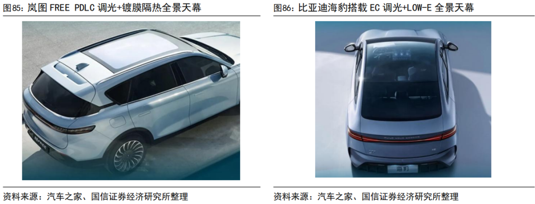 天幕舒适、隐私需求升级,福耀新品储备充足,调光、镀膜天幕有望进入爆发时刻。福耀在天幕领域占据龙头位置,积极布局调光、镀膜产品,已供货主流自主品牌电动智能车。目前,福耀的调光玻璃产品可分为PDLC 调光玻璃、热致变色玻璃和 EC 调光玻璃,其中 PDLC 可调光全景天幕玻璃作为选配件已搭载于岚图FREE,可实现 10 级透亮度可调,隔绝 99%的紫外线;热致变色玻璃可定制多种玻璃颜色,且颜色可随温度变化而变化;EC 调光天幕具备低雾度、智能感应自动调光、隔热隔紫外线等特点,采用光弈的 EC 电致变色技术,实现渐变式变色调光,搭载于极氦 001、广汽 AION S PLUS、比亚迪海豹等车型。