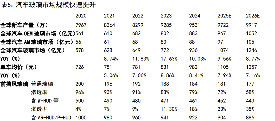 量端,24年公司全球市占率36%+,同比+1.88pct,2025Q3持续跑赢国内汽车产量4pct。公司积极在福清、安徽、北美扩产,有望开启新一轮产能周期,增强头部企业虹吸效应,市占率有望持续提升。价端,汽玻单平方米价格由20年174元提升至24年229元,CAGR为7.0%,伴随高附加值玻璃渗透,我们预测行业单车价值25-27年CAGR为7%+。