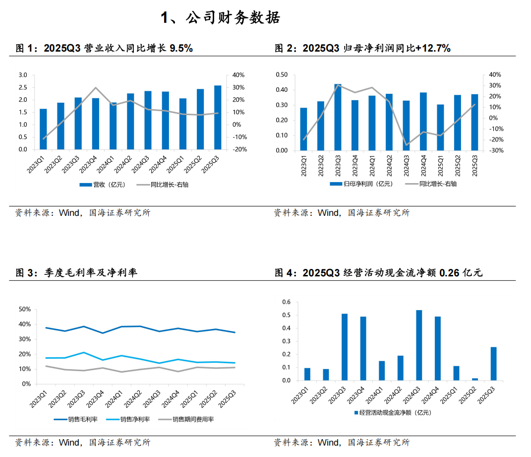 2025年Q3单季度,公司实现营业收入2.58亿元,同比+9.5%,环比+5.8%;实现归母净利润0.37亿元,同比+12.7%,环比+1.4%;扣非后归母净利润0.35亿元;经营活动现金流净额为0.26亿元。销售毛利率为34.59%,同比-0.67个pct,环比-2.11个pct;销售净利率14.27%,同比-0.2个pct,环比-0.54个pct。