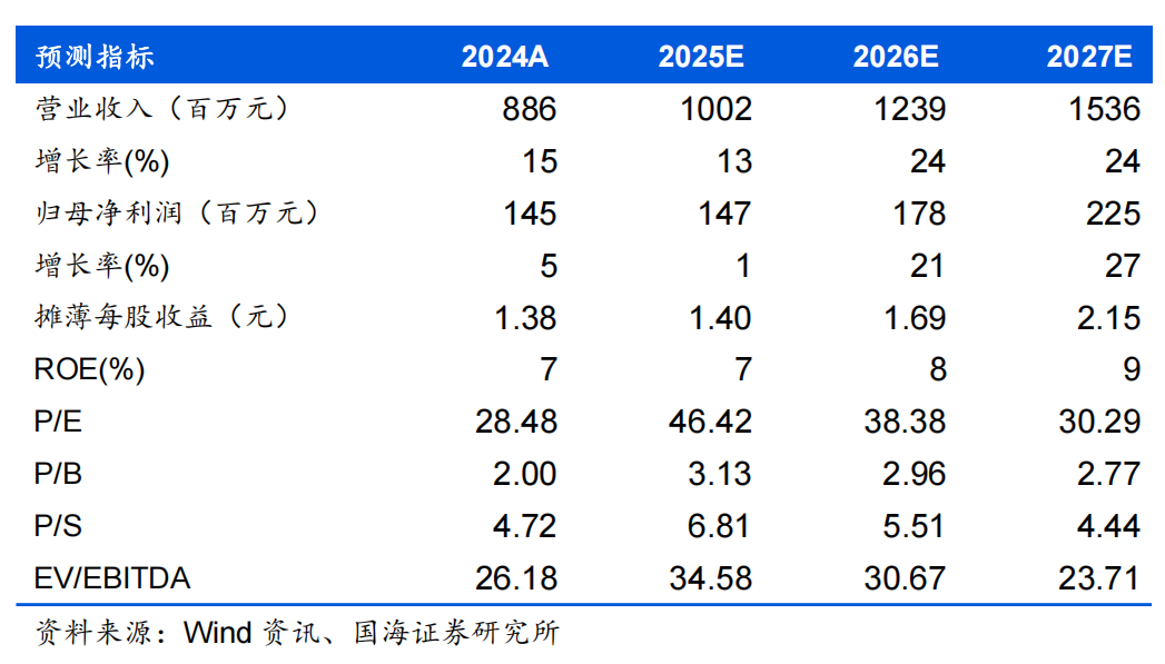 基于审慎性原则,暂不考虑后续发行股份摊薄因素及收购影响,预计公司2025/2026/2027年营业收入分别为10.02、12.39、15.36亿元,归母净利润分别为1.47、1.78、2.25亿元,对应PE分别为46、38、30倍,维持“买入”评级。