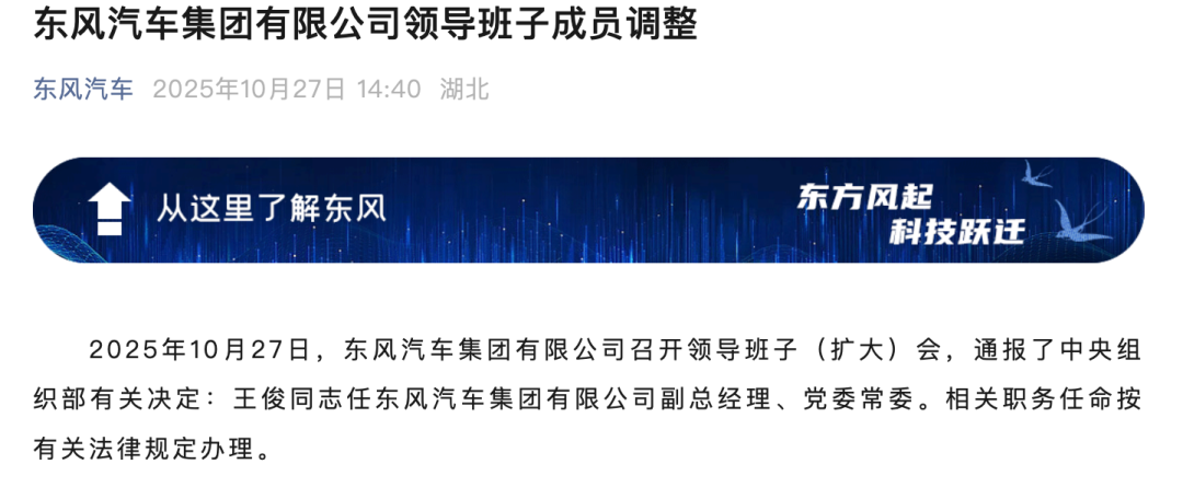 10月27日,东风汽车集团有限公司召开领导班子(扩大)会,通报了中央组织部有关决定:王俊同志任东风汽车集团有限公司副总经理、党委常委。