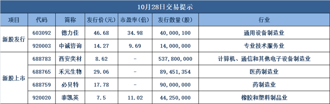 3、科创板:10月28日,禾元生物、西安奕材、必贝特三家未盈利公司将登陆科创板,成为科创板科创成长层首批新注册公司。这标志着未盈利的硬科技企业上市路径进一步畅通。