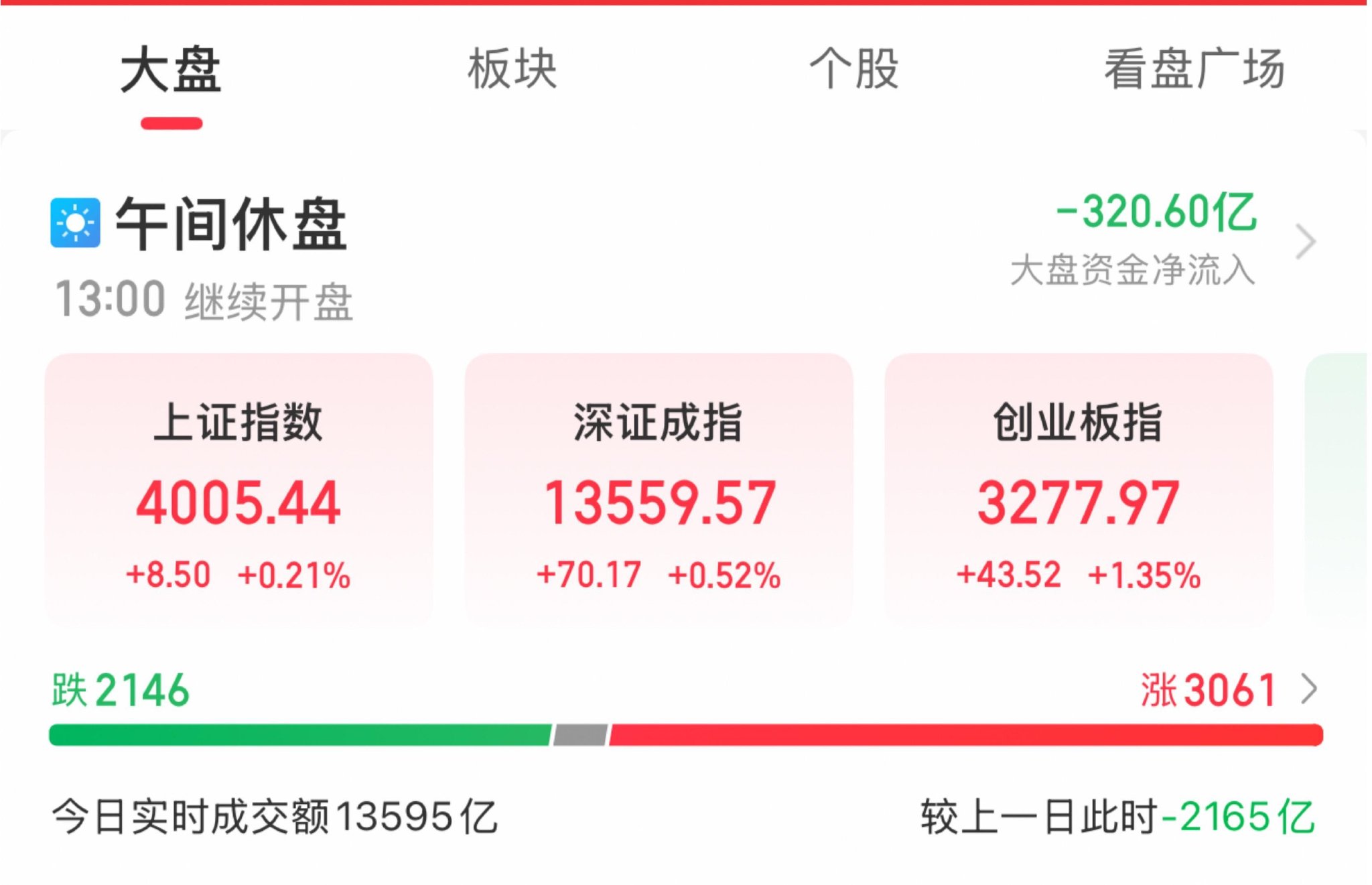 A股三大指数早盘集体上涨,截至午盘,上证指数涨0.21%,深成指涨0.52%,创业板指涨1.35%,北证50跌0.27%。沪深京三市半日成交额13595亿元,较上日缩量2165亿元。全市场超3000只个股上涨。