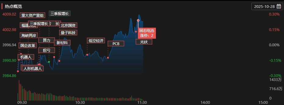 盘面上,福建本地股延续强势,达华智能(002512)、平潭发展(000592)4连板,福建水泥(600802)、海峡创新(300300)2连板,厦门空港(600897)、厦工股份(600815)多股封板。CPO算力硬件股盘中冲高,中际旭创(300308)、新易盛(300502)、工业富联(601138)等股续创历史新高。量子科技概念股延续活跃,西部超导盘中创新高,电子城、格尔软件(603232)涨停。另一方面,煤炭板块多股调整,大有能源(600403)盘中跌停,云煤能源(600792)、昊华能源(601101)、陕西黑猫(601015)纷纷调整。贵金属板块同样调整,招金黄金(000506)、湖南白银(002716)、晓程科技(300139)等股下挫。