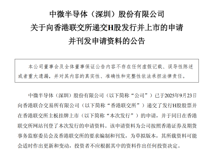 根据公司公告,中微半导体(深圳)股份有限公司已于2025年9月23日向香港联合交易所有限公司(以下简称“香港联交所”)递交了发行H股股票并在香港联交所主板挂牌上市的申请,并于同日在香港联交所网站刊登了本次发行的申请资料。