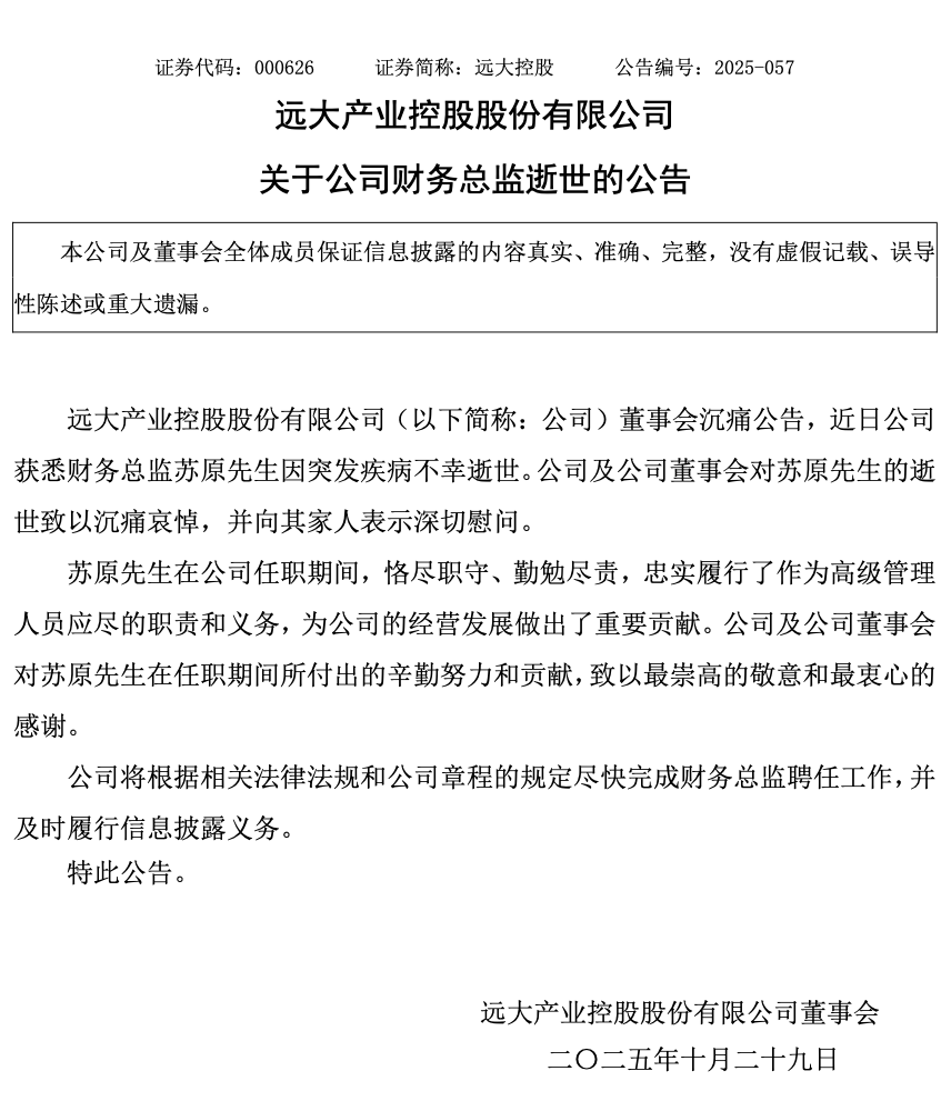 10月28日,远大控股公告,近日公司获悉财务总监苏原因突发疾病不幸逝世。公司及公司董事会对苏原的逝世致以沉痛哀悼,并向其家人表示深切慰问。