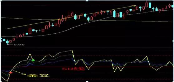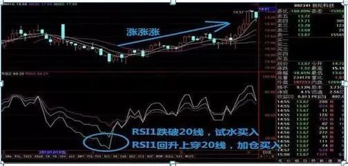 当RSI白线与黄线同时处于50以下的时候,突然一块上行,并且白线向上击穿黄金,这时就是超短线的一个强烈买入信号了,不过这也只是一种信号,我们在实际操作时应该结合成交量的变化来决定买卖。