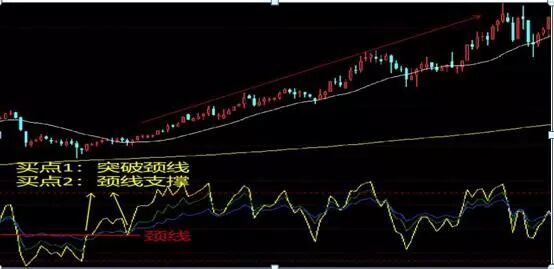 当RSI6先突破颈线时,就形成了比较好的买点。对于比较保守的投资者,等待RSI6再次回调到颈线时,形成支撑反弹,也是好的入手点。