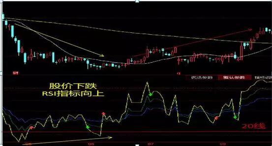 当RSI指标处于20以下低位,率先止跌企稳,形成向上走势;此时K线图上的股价却仍一路下跌,一波比一波低,这就是底背离。