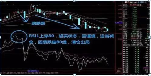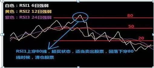当RSI白线突破了80的时候,说明市场已经进入了超买状态,这个时候股价继续上升的空间就十分小了。可以适当的卖出股票,选择轻仓观望。如果RSI白线见顶回落跌破了80以后,就可以清仓出局了,股价顶部已经形成。