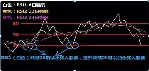 当RSI白线跌破20的时候,说明股市已经进入了超卖的区域,一般在这个时候股价继续下跌的空间已经不大了,可以试探性的建仓,在股价出现反弹,并且RSI白线重新突破20的时候选择加仓。不过毕竟是超跌反弹,进场离场都要快。