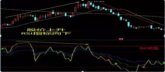 当RSI指标处于高位,形成一峰比一峰低的走势;而此时K线图上的股价却再次创出新高,形成一峰比一峰高的走势,这就是顶背离。