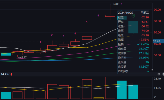 2024年10月29日因赛集团复牌后,股价直接以19.99%的幅度一字涨停,10月30日继续冲高,盘中最高触及94元/股,较10月11日的收盘价(49.65元/股)上涨89%。