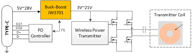 在15W/25W/50W无线快充应用中,JW3701通过I²C接口的PPS调压机制可快速根据设备需求,动态调节输出电压,为用户带来更安全、更稳定的无线充电体验。